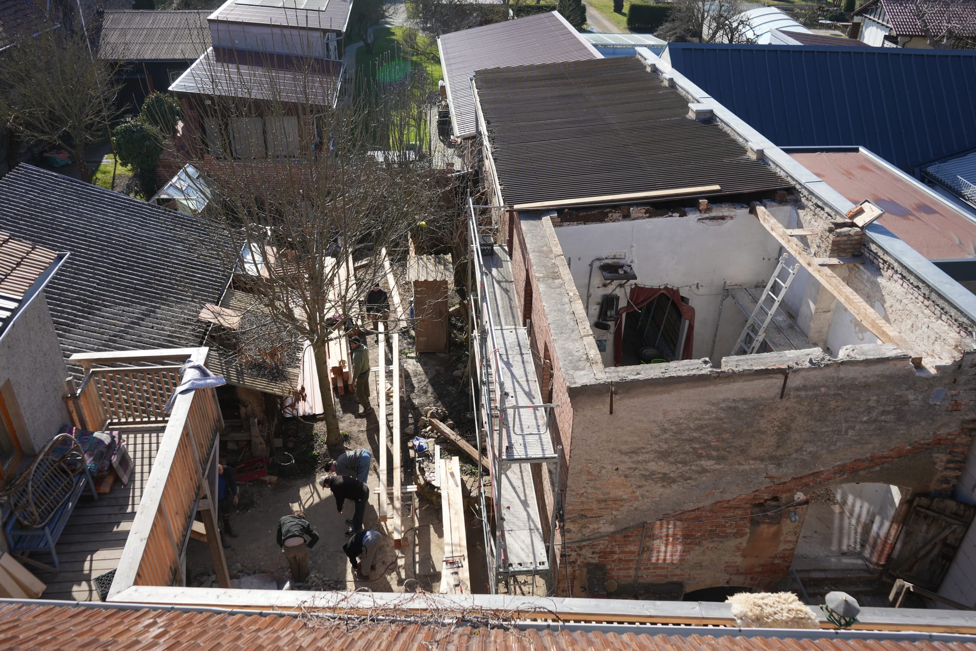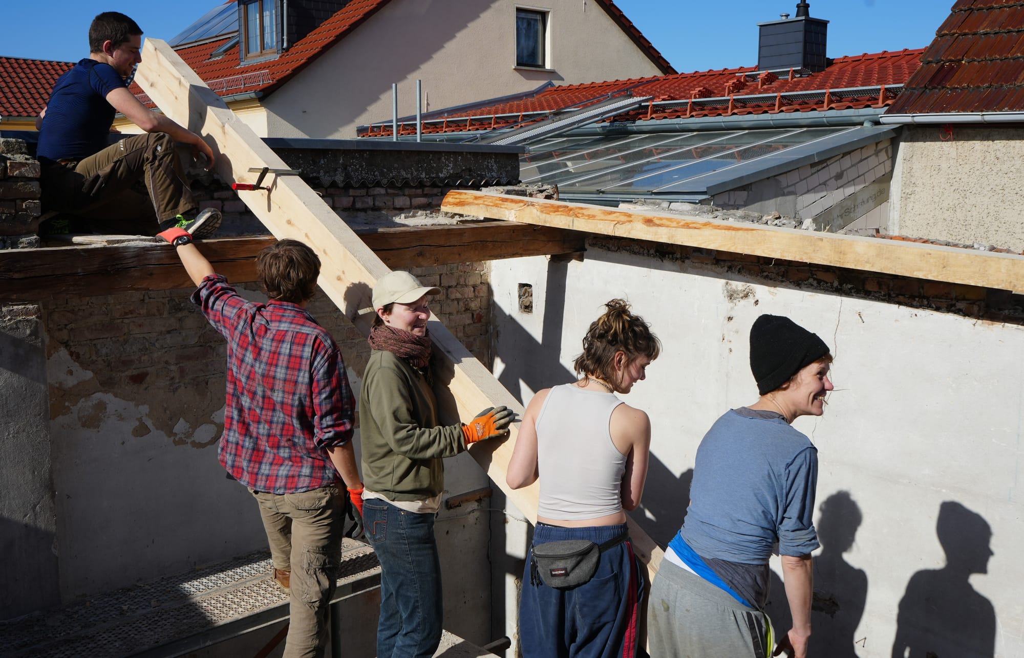 Der Schwerpunkt liegt dabei auf dem praktischen Arbeiten direkt auf der Baustelle: Wir klären, welche Materialien sich sinnvoll wiederverwenden lassen, und errichten im Zusammenspiel mit regionalem Holz ein neues Tragwerk aus massiven Sparren, Verschalen, Dämmen und Decken das Dach. Anschließend wenden wir uns dem nächsten Bauabschnitt zu. Und sorgen für Zugänglichkeit der Räume durch einen Treppenaufgang.